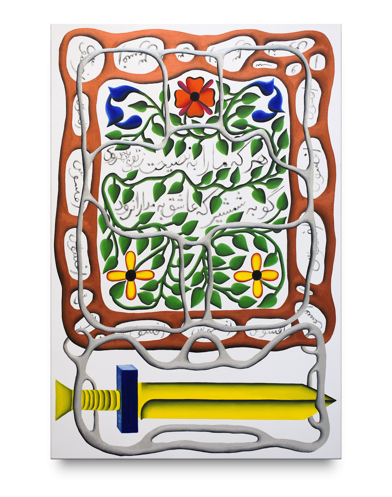 نوشتن لزوما همیشه ارزشی به پروسهی دیدن هنر تجسمی و درکش اضافه نمیکند؛ گاهی میکاهد و گاها میافزاید. از این رو نوشتهای که بتواند دقت و تیزبینی مخاطب را در مواجهه با اثر بالاتر ببرد، به توفیق رسیده است. بهترین راه درک هنر تصویری، خوب نگاه کردن به همان تصویر است، احتمال آن وجود دارد آنچه که من در کارهای علی انصاری میبینم با شما تفاوت داشته باشد و کیفیات را به شکل دیگری معنا کنم. اولویت من با آنچه که میبینم و حس میکنم آغاز میشود. بر این باورم اگر بیننده به نگاه و احساسش نسبت به اثر هنری اعتماد کند، این اعتماد میتواند مقدمهای مطمئن برای افزایش مداوم درک بصری فرد شود. آنچه به نظرم ارزش دیدن دارد و از نگاه کردن به تصاویر به من میرسد ارجاعات تصویری متعدد و واضح درونفرهنگیست که همزمان زبان تصویری معاصر خارج از منطقه را هم همراه خود دارد. اینکه این مجموعه همزمان با کیفیات تصویری و رفتارهای معاصر چنان مضامینی درون فرهنگی را نمایش میدهند برای من جالب است. علاوه بر تاکید نقاش بر روی عناصر نقاشی، نحوه کنار هم قرار گرفتن آنها نیز حائز اهمیت است. خطوطی از رنگهای مسی و نقرهای لایه های تصویری را از هم جدا کردهاند و شکل کلی نقاشی را ساختهاند. این شکل از فضاسازی برای من نوعی از چیدمان است.