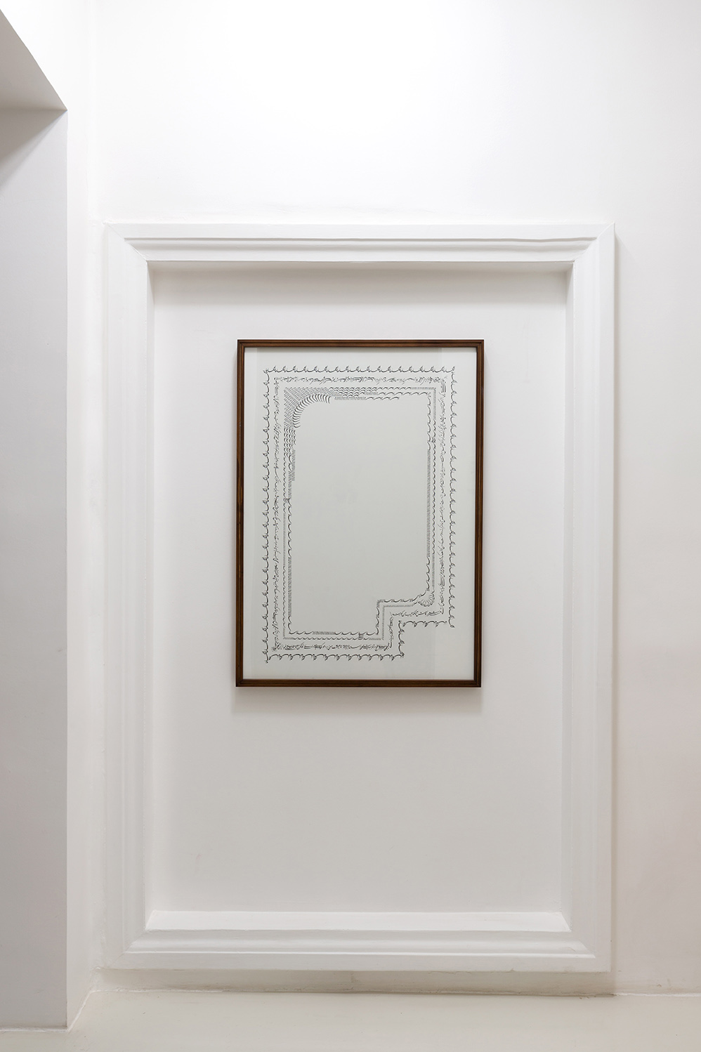 Masoumi entered contemporary art via her practice and background in calligraphy. One can still trace the influence of Persian poetry and literature in her references and her Mashgh practices of appropriations and adaptations. Nevertheless, her work is neither Siāh-Mashgh (overlaying of calligraphic practices) nor Khat-Naghāshi (calligraphic painting). The realm of contemporary art provides Masoumi with the opportunity to use all of her forces to create an image and an idea. In the past, to create the content of a page of a book, the poet would give the text to the calligrapher, and after writing the text, the calligrapher would hand it over to the painter, and after finishing the painting, the painter would send the paper to the binder to make a worthy frame. Masoumi, whose palette is her calligraphic hand, has taken on all these roles in her work process. Her pen is made up of letters, words, and text. She utilizes both the untapped potential of calligraphy and type, and the meanings and sounds hidden in letters and words. Her work explores the relationship between these words in Persian writing and the formal relationships of composition, drawing, and dimension. This coherence of words and sentences with each other exists both in the details of the work and in its final general form. The reason behind this is the same type of production mechanism mentioned above.