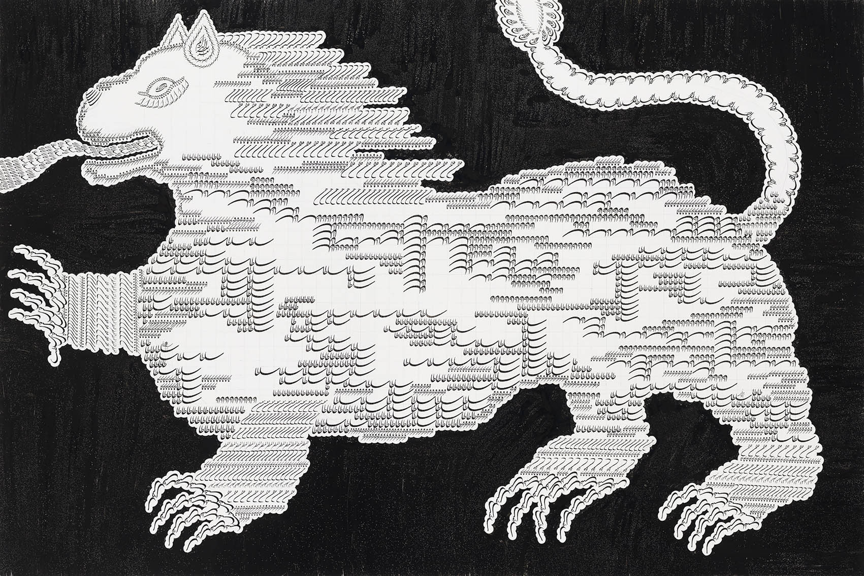 On one hand, Mina Masoumi’s visual and semantic references are intertwined with Iranian history, culture, and literature. She studies the historical identity of the lion in Iranian culture and at the same time examines the role of the lion’s image on tablets, reliefs, and sculptures. She creates a work inspired by Saadi’s “On the Manners of Conversation” and in another work references words inscribed by the Ottomans on their weapons. On the other hand, her works have a deep connection with the inner workings of modern image processing devices. Processors use letter and word encoding both to produce and present images. They convert the original image into binary code and then send them to their final destination via radio waves, wires or satellites. They eventually provide us with a device that we can convert these codes back into an image. In a more primitive form, a decade or two ago, we sent a picture of a cat or a large heart made up of letters, numbers, and parentheses to our beloved ones on our early mobile phones. Now, the modern world has provided us with the ability to exchange more than just cats whose paws are made up of the letter M.